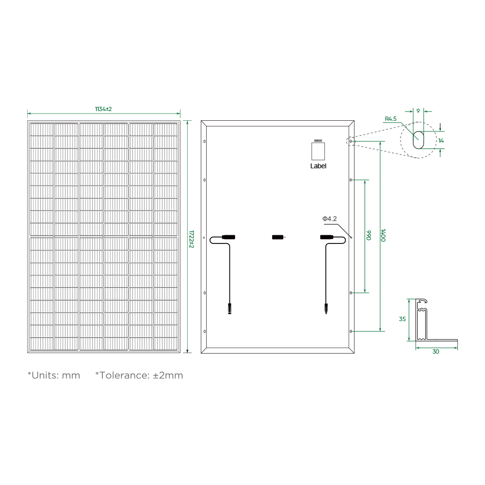 4.0mm2, Portrait: 300mm / Landscape: 1300mmWind/Snow Load: :
