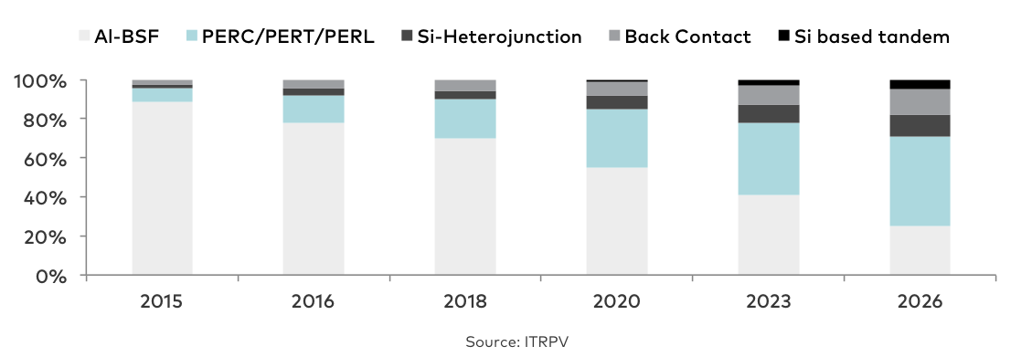 As anticipated by ITRPV, a body that gathers a set of manufacturers at the different steps of the value chain and that works on technology trends, the PERC technology will progressively take the biggest market share. Because this is the sense of history in the PV industry to get better and better, sooner or later, most of the panels installed will feature this technology.