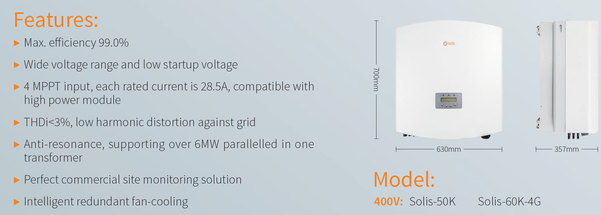 Solis-50K/60KSolis 4G inverter THDi<3, low harmonic distortion against grid. Adopt anti-resonance,signle transformer can connect 6M+ in parallel. Perfect commercial site monitoring solution, intelligent redundancy fan.