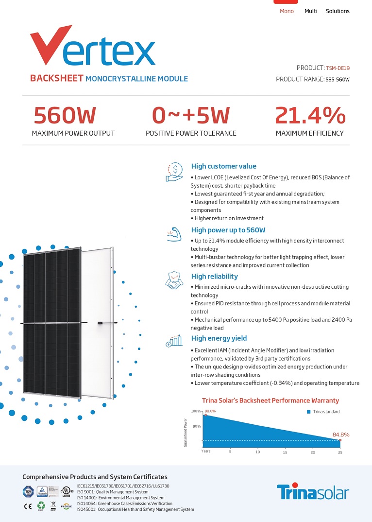 1. Up to 560W, Up to 21.4% module efficiency with high density interconnect technology